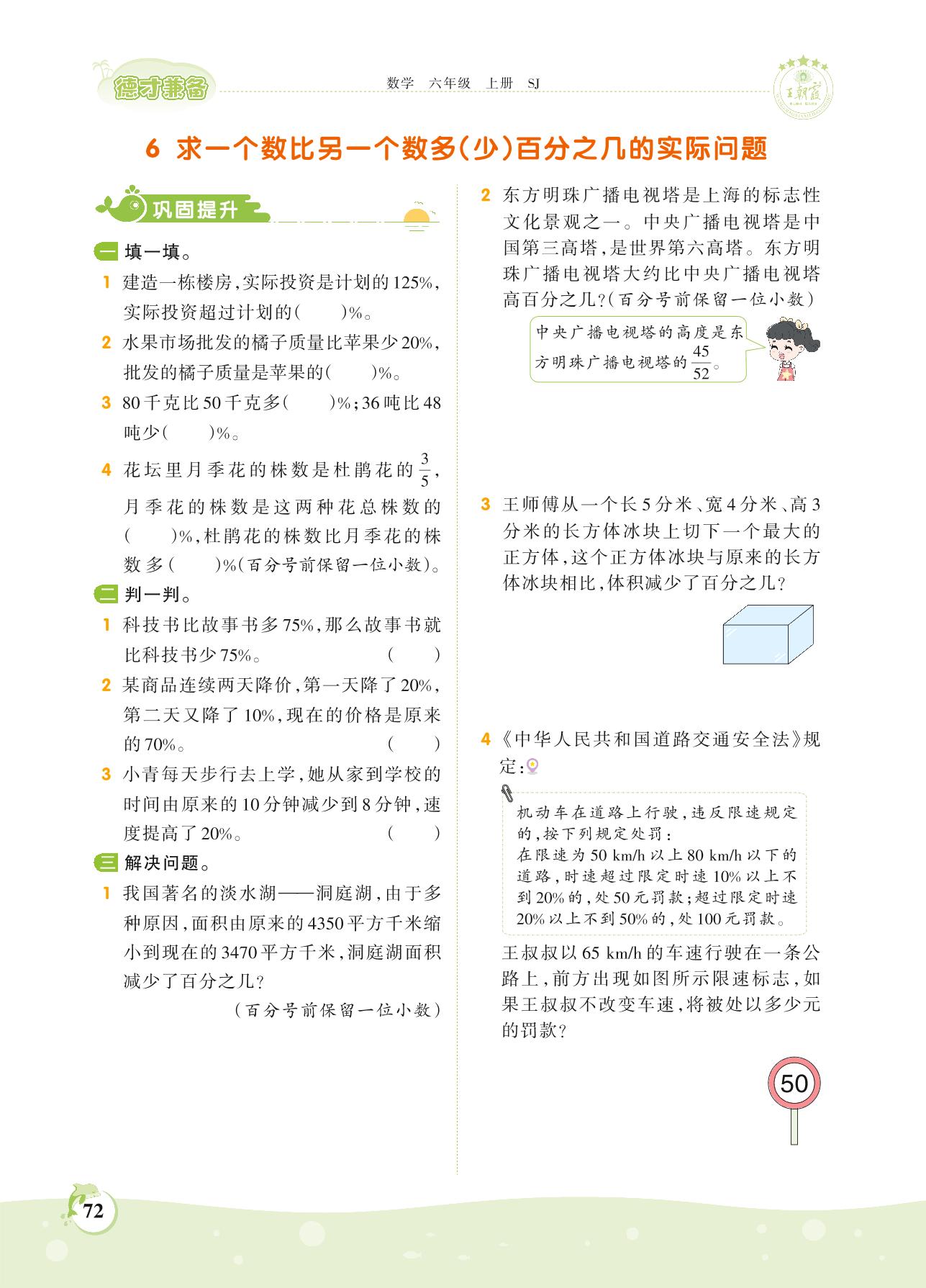 2021上册六年级数学苏教版 第六单元——6 求一个数比另一个数多(少)百分之几的实际问题