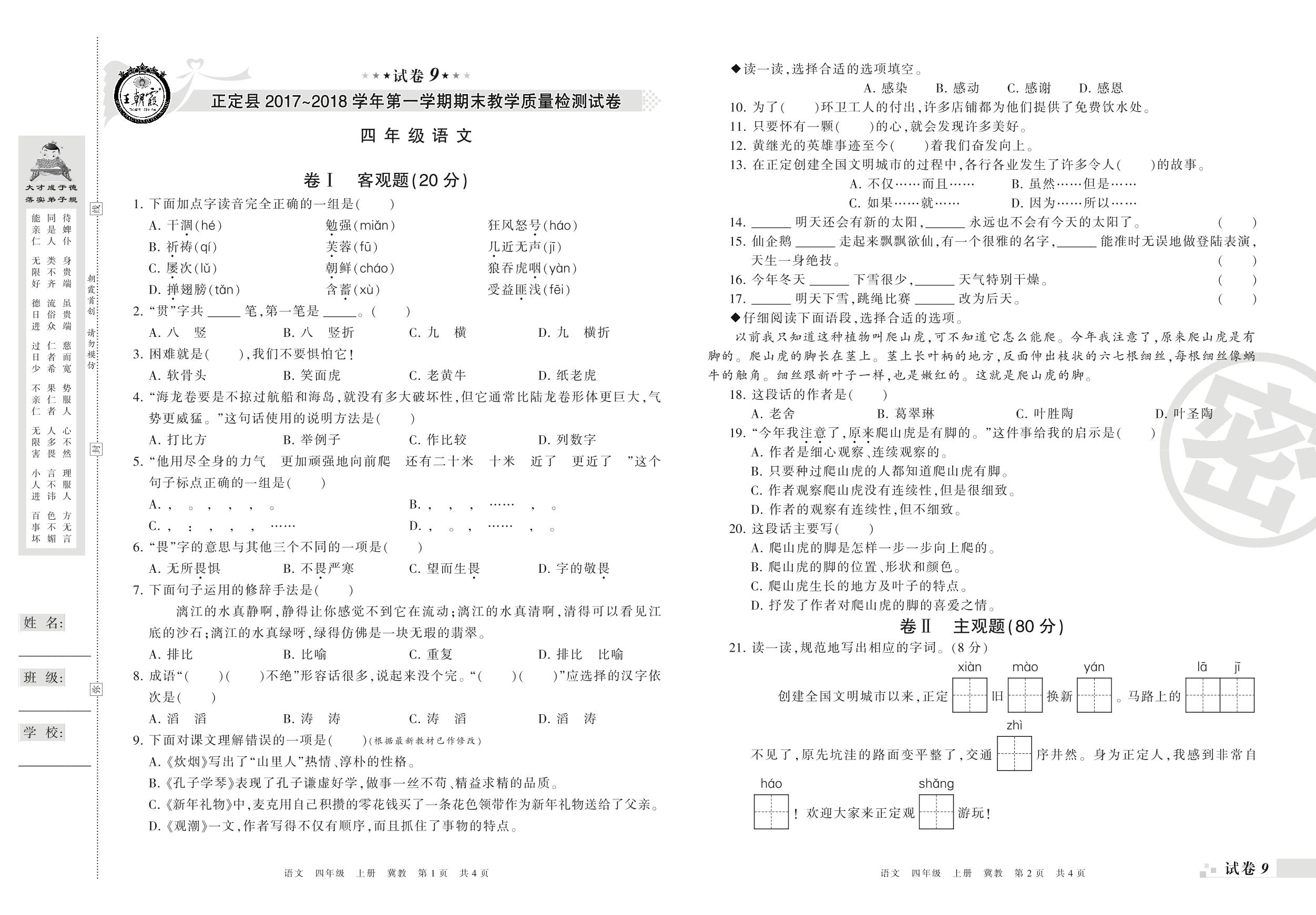 2017-2018学年第一学期石家庄市正定县四年级语文试卷(冀教版)【9】