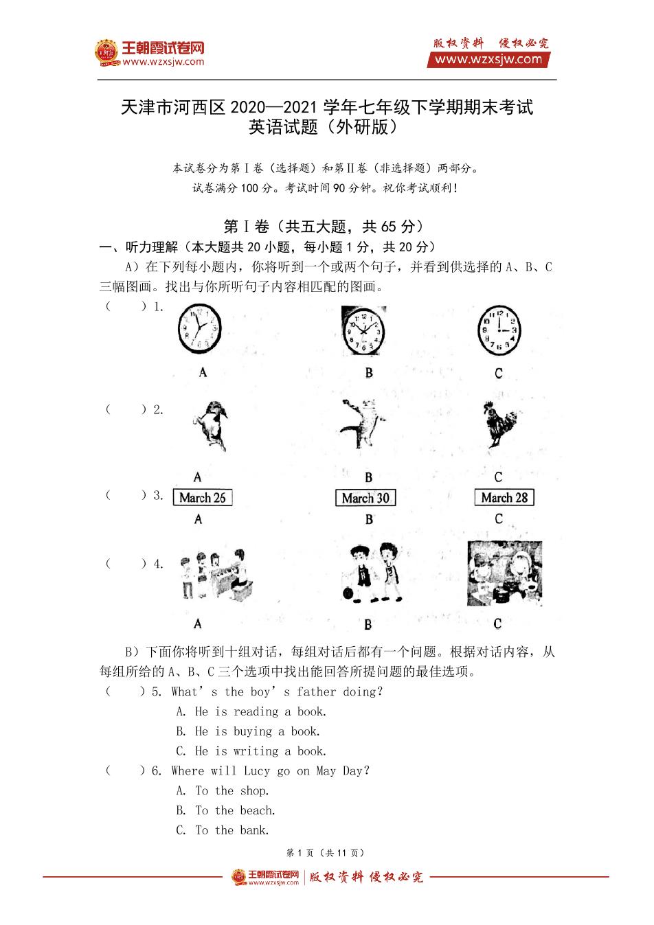 天津市河西区2020—2021学年七年级下学期期末考试英语试题(外研版)