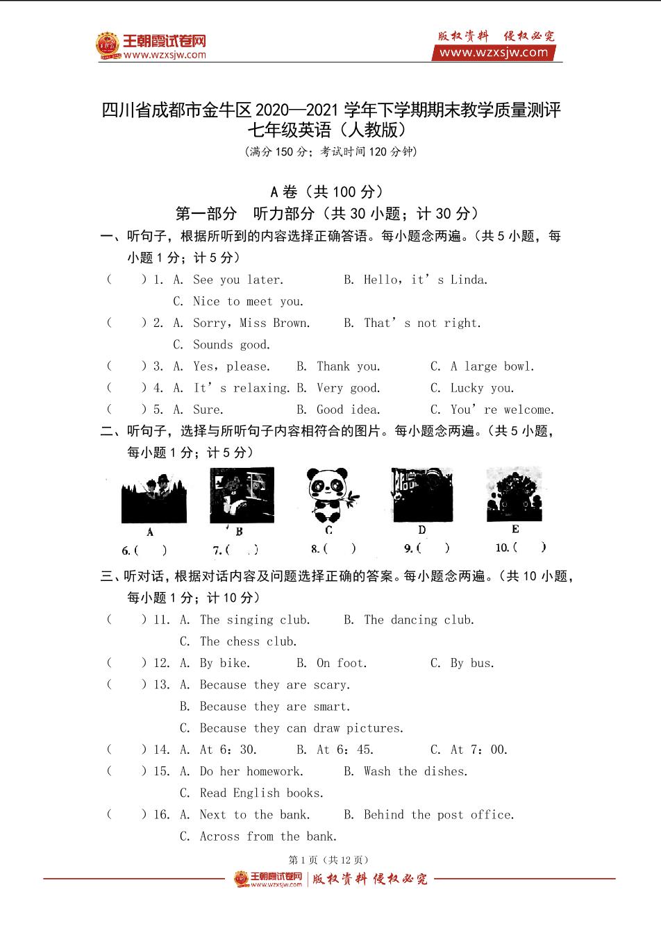 四川省成都市金牛区2020—2021学年下学期期末教学质量测评七年级英语(人教版)