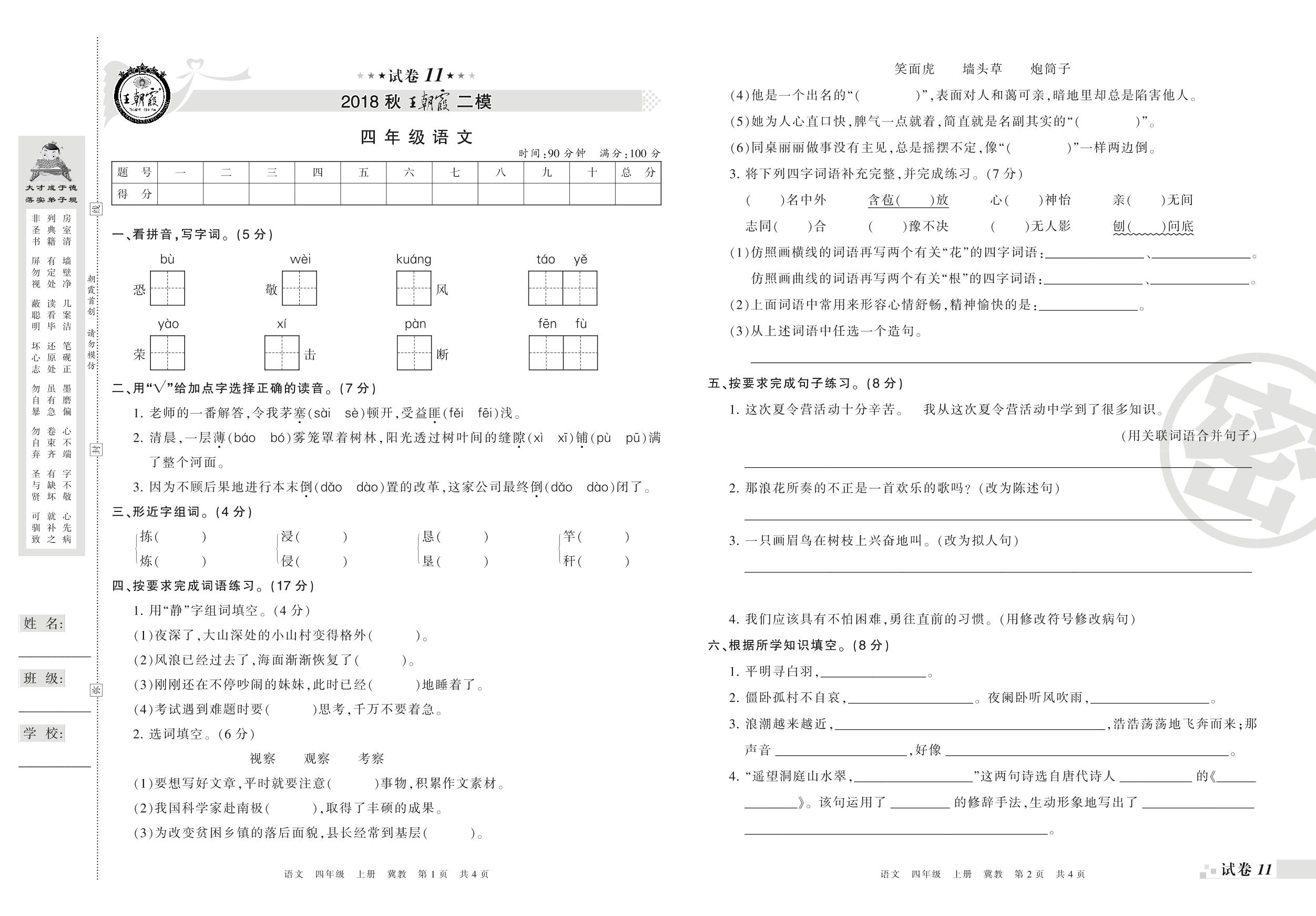 王朝霞期末模拟卷四年级上册语文(冀教版)【11】
