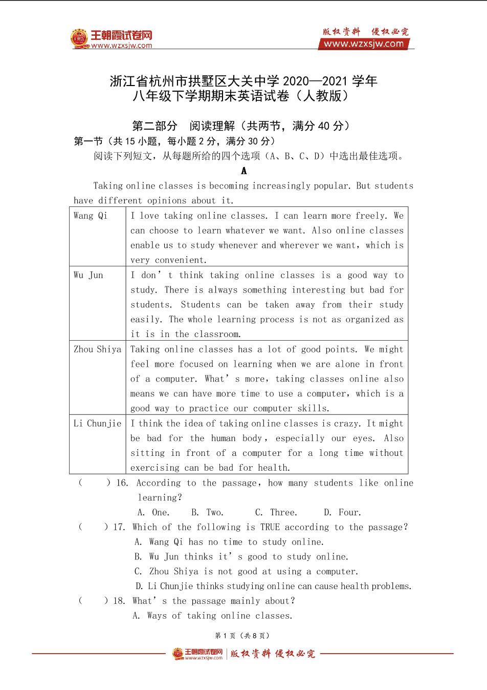 浙江省杭州市拱墅区大关中学2020—2021学年八年级下学期期末英语试卷(人教版)【无听力音频】