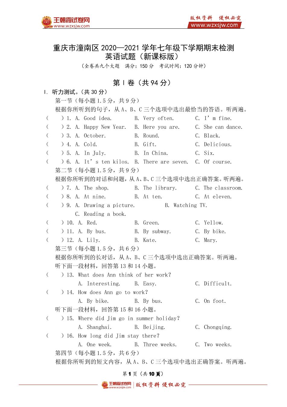 重庆市潼南区2020—2021学年七年级下学期期末检测英语试题(新课标版)【无听力音频】