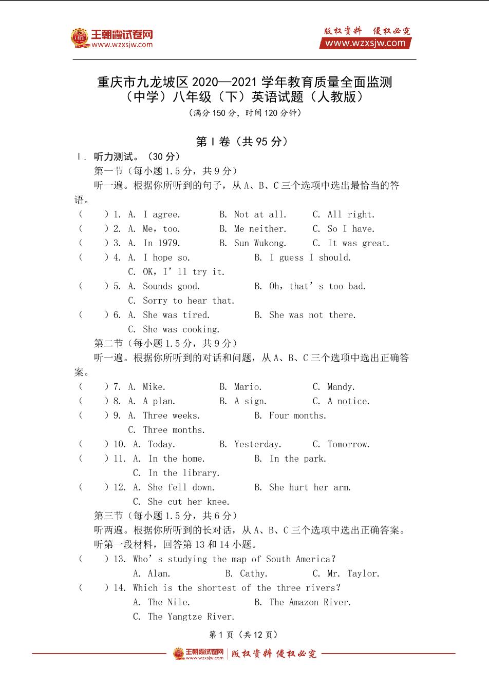 重庆市九龙坡区2020—2021学年教育质量全面监测(中学)八年级(下)英语试题(人教版)【无听力音频】