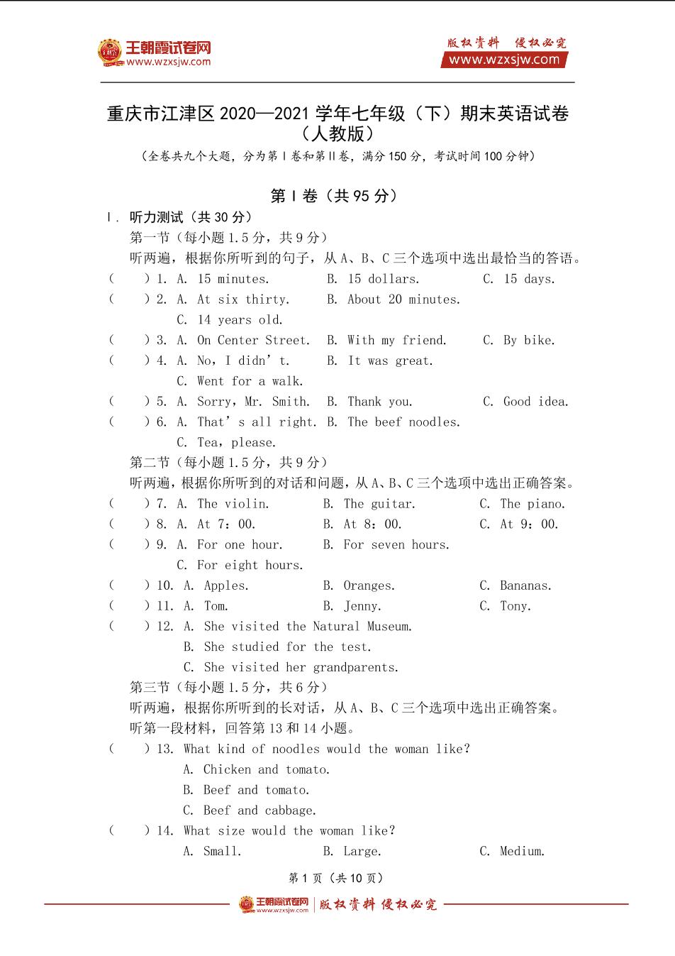 重庆市江津区2020—2021学年七年级(下)期末英语试卷(人教版)【无听力音频】
