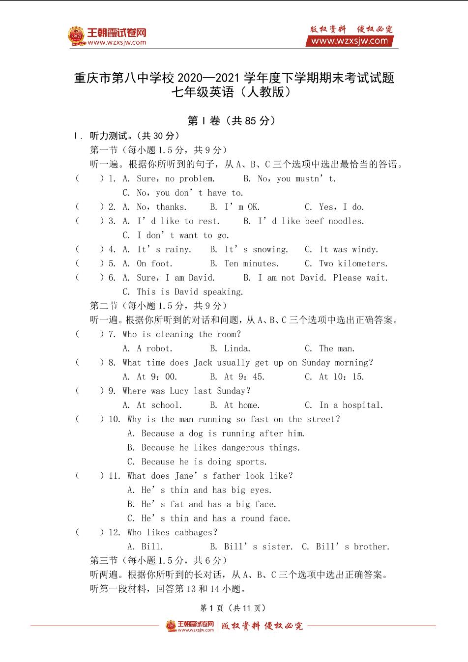 重庆市第八中学校2020—2021学年度下学期期末考试试题七年级英语(人教版)【无听力音频】