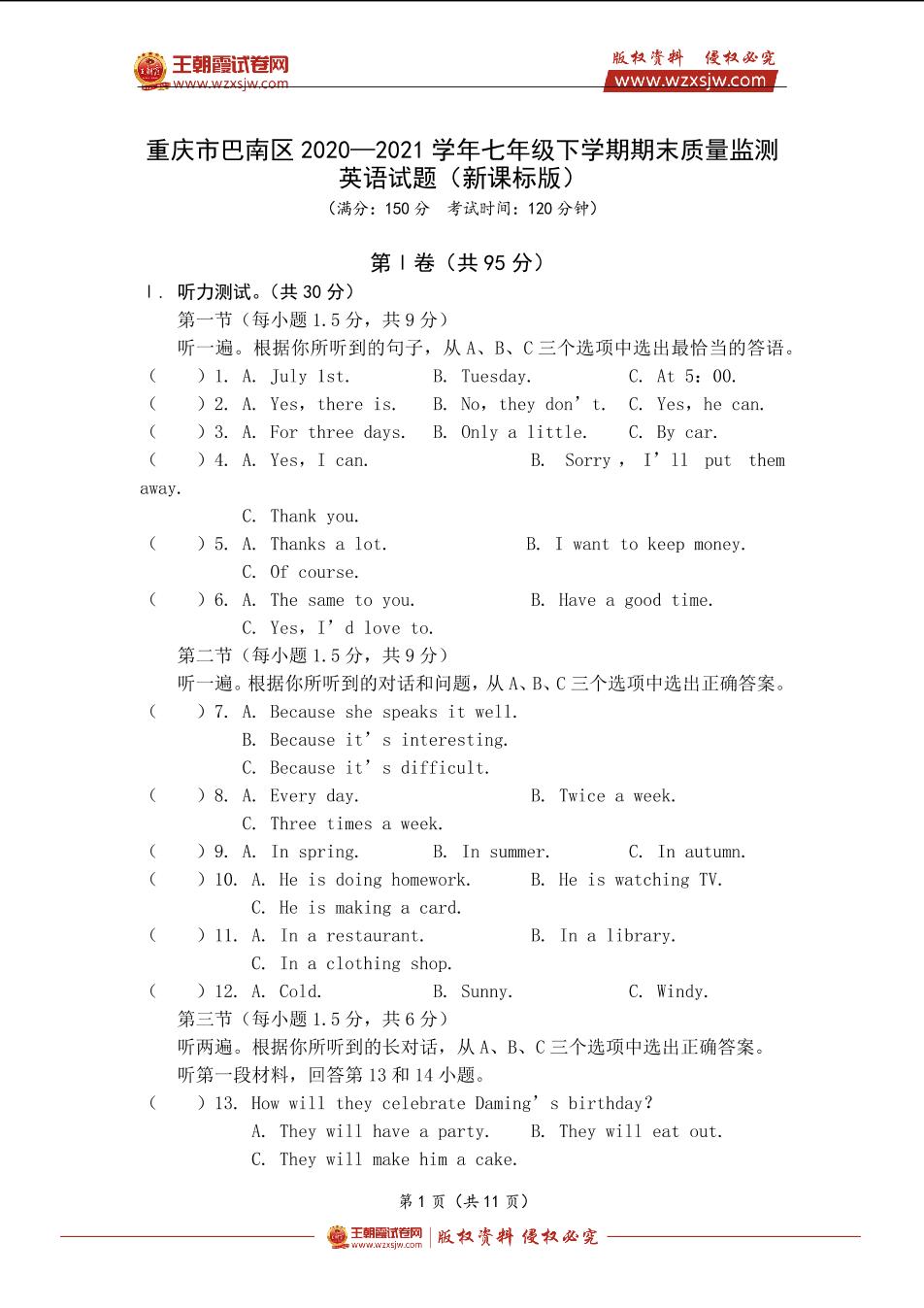 重庆市巴南区2020—2021学年七年级下学期期末质量监测英语试题(新课标版)【无听力音频】