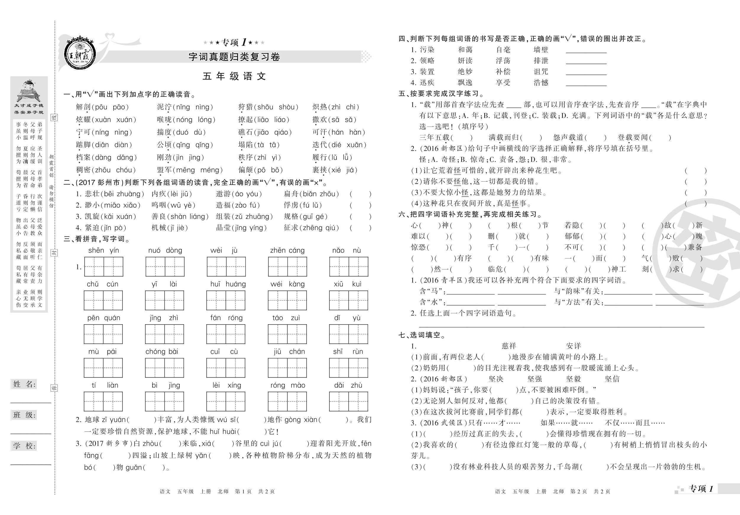 王朝霞期末专项卷——字词、句子与语言表达真题归类复习五年级上册语文(北师版)【0】