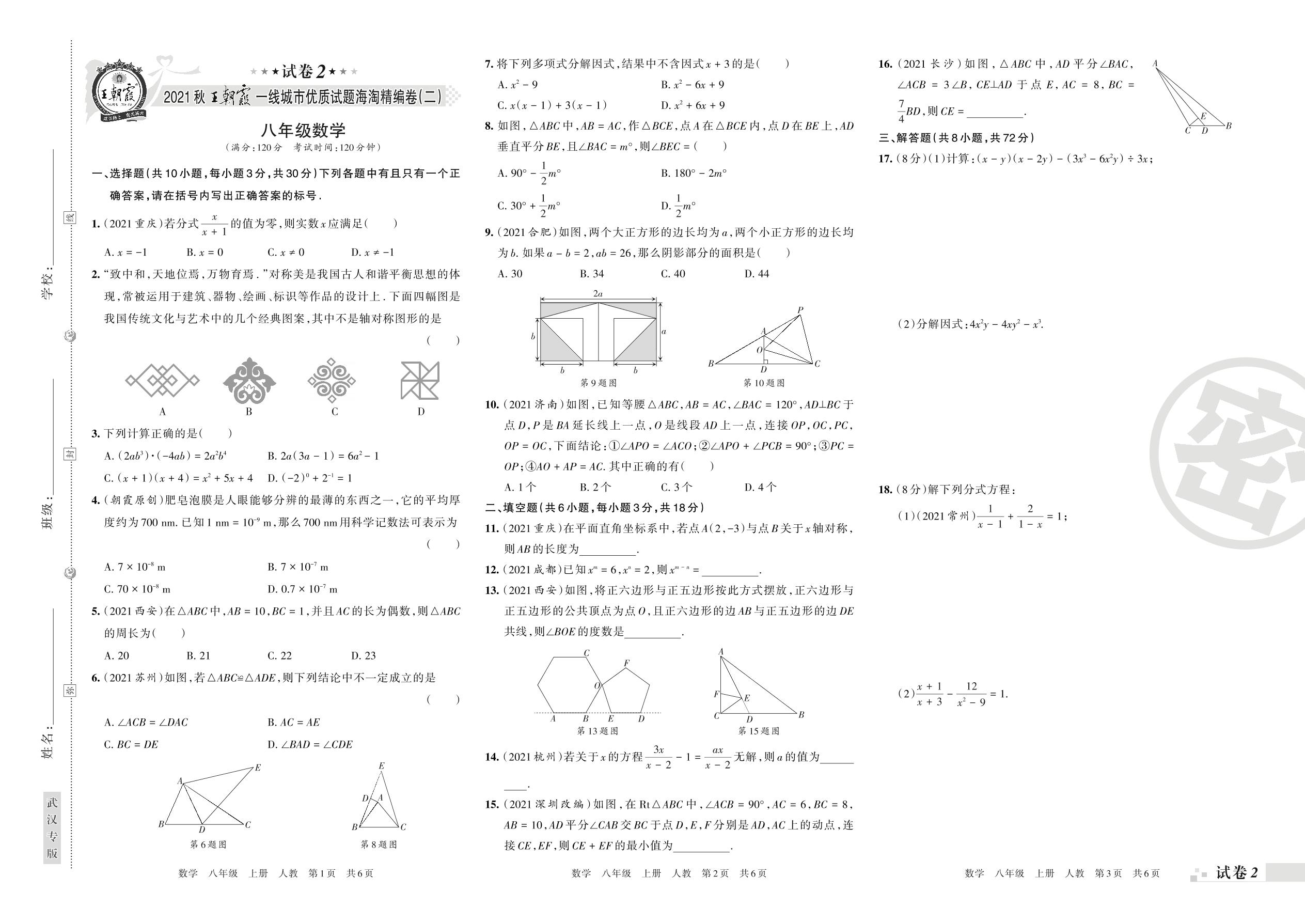 2021秋王朝霞一线城市优质试题海淘精编卷(二)八年级上册数学(人教版)【2】