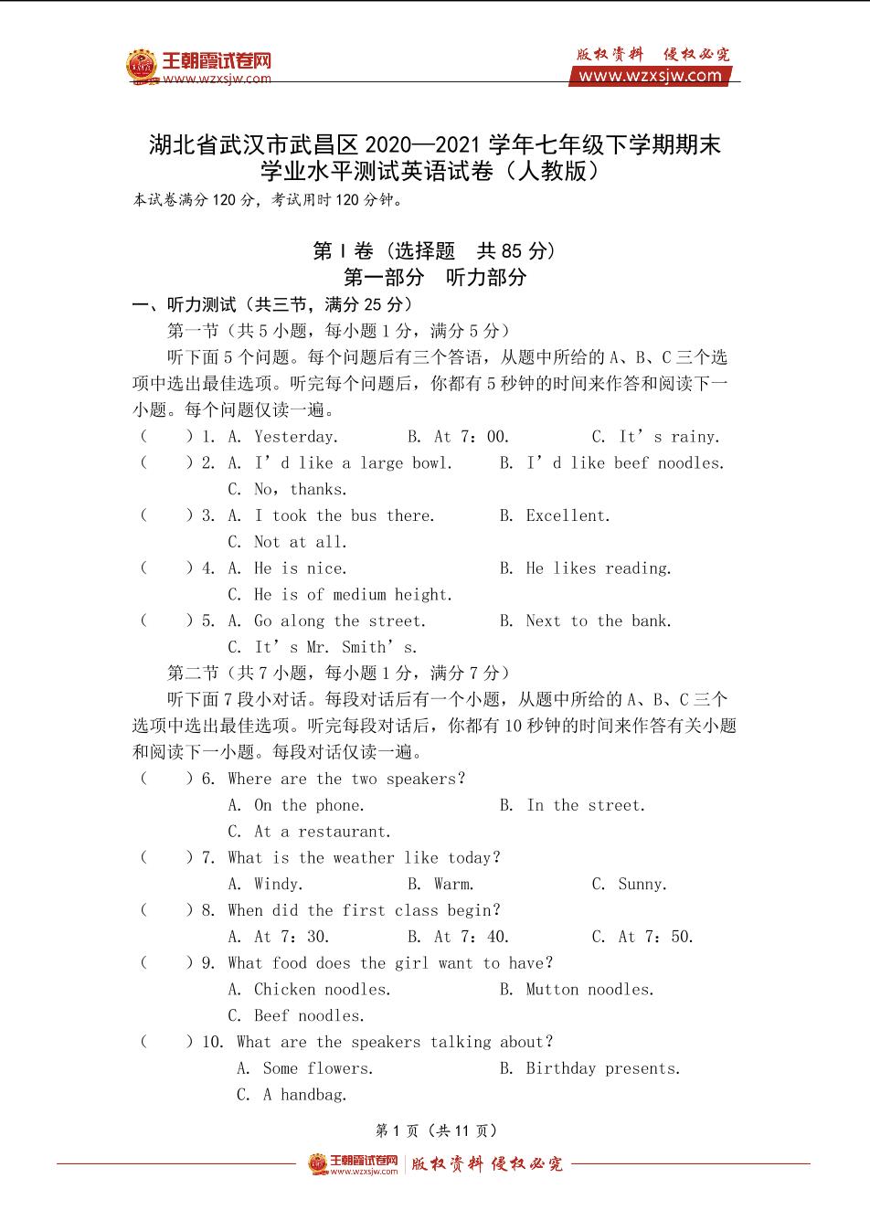 湖北省武汉市武昌区2020—2021学年七年级下学期期末学业水平测试英语试卷(人教版)【无听力音频】