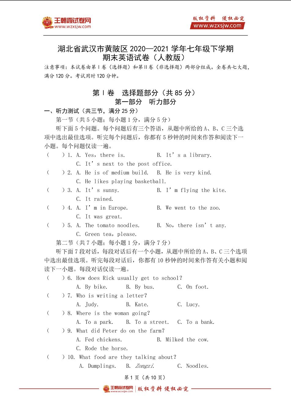 湖北省武汉市黄陂区2020—2021学年七年级下学期期末英语试卷(人教版)【无听力音频】