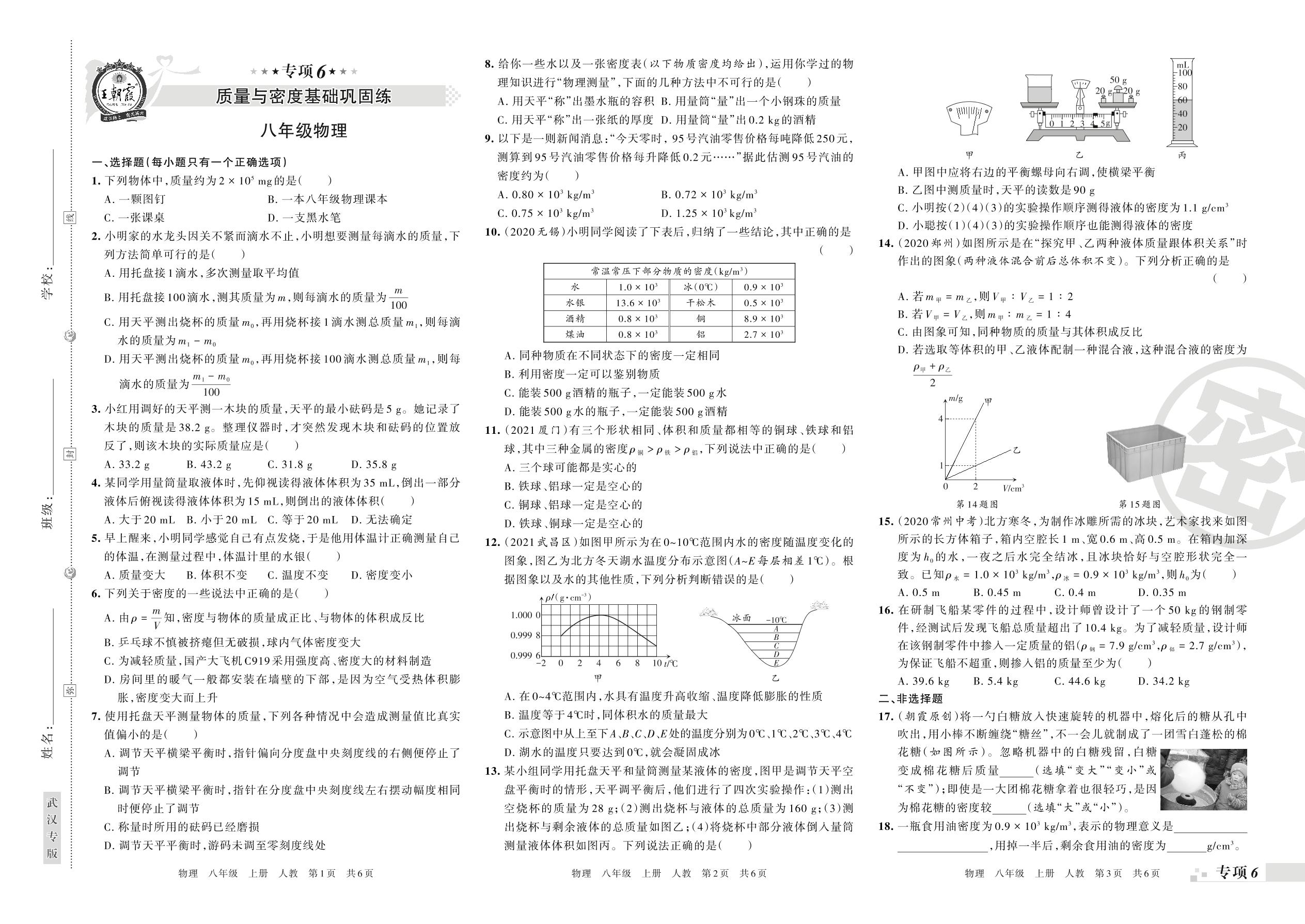 王朝霞期末专项卷——质量与密度基础巩固练八年级上册物理(人教版)【6】
