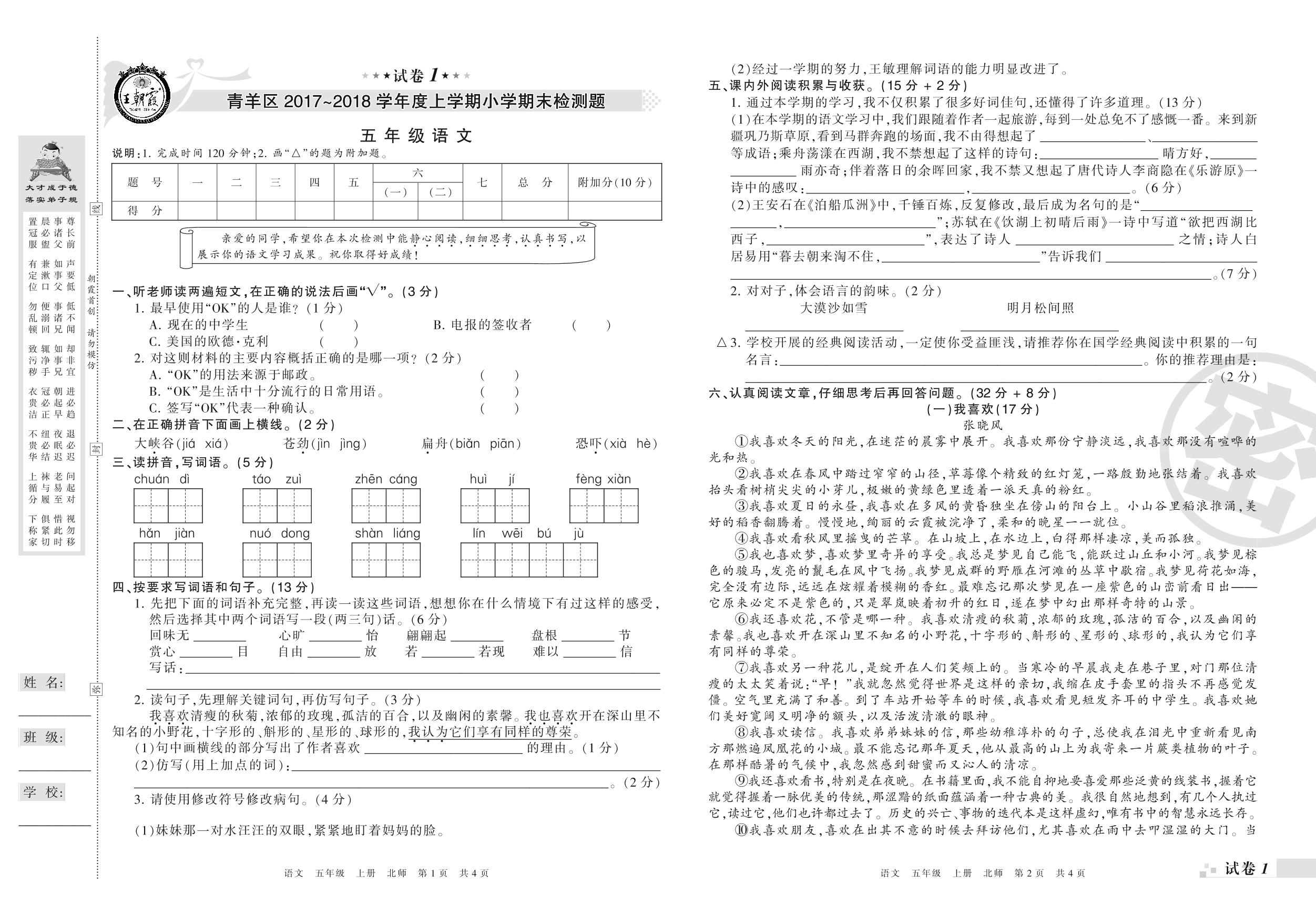 2017-2018学年第一学期成都市青羊区五年级语文试卷(北师版)【1】