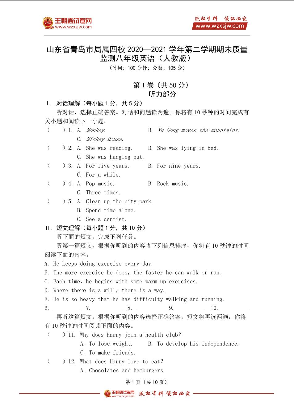 山东省青岛市局属四校2020—2021学年第二学期期末质量监测八年级英语(人教版)【无听力音频】
