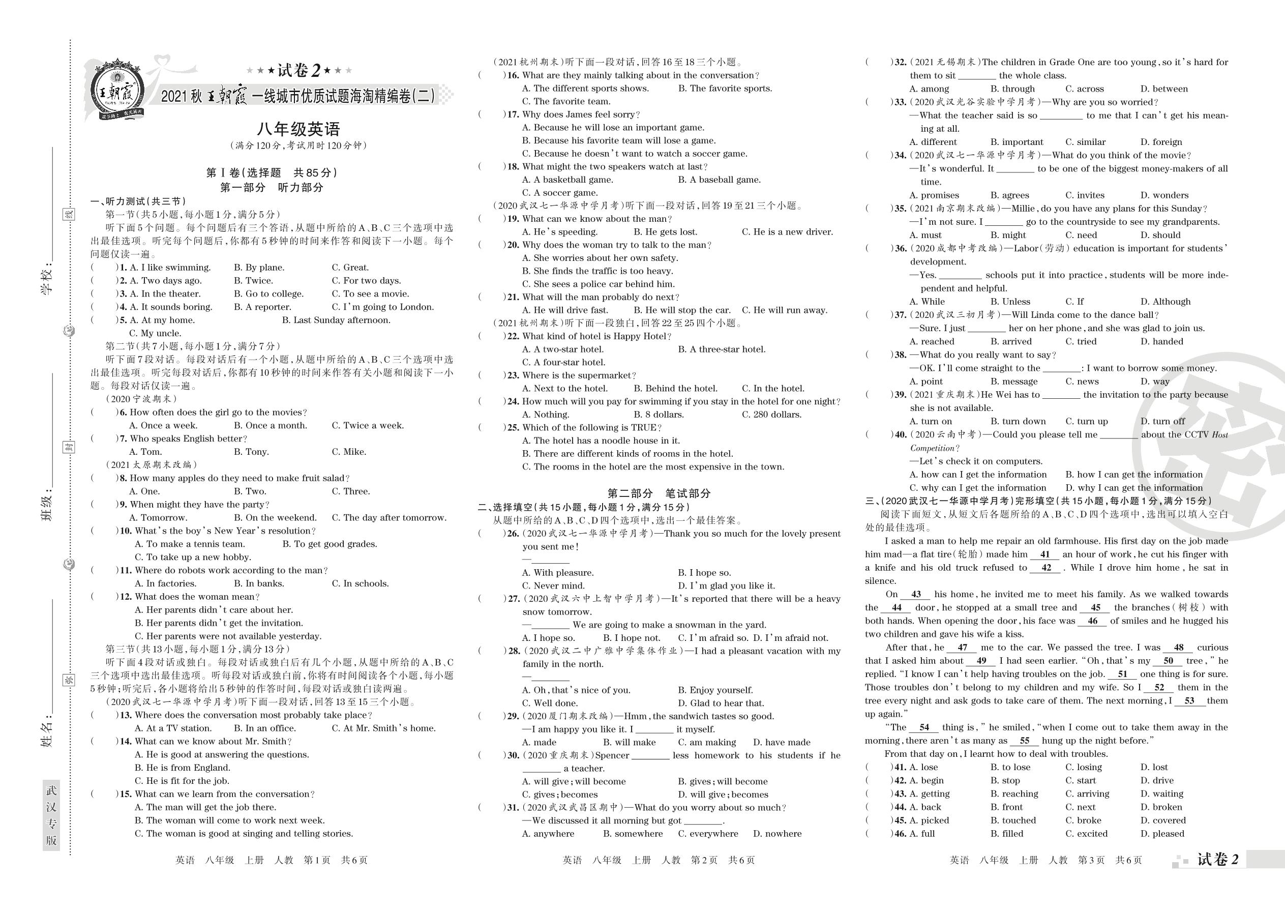 2021秋王朝霞一线城市优质试题海淘精编卷(二)八年级上册英语(人教版)【2】