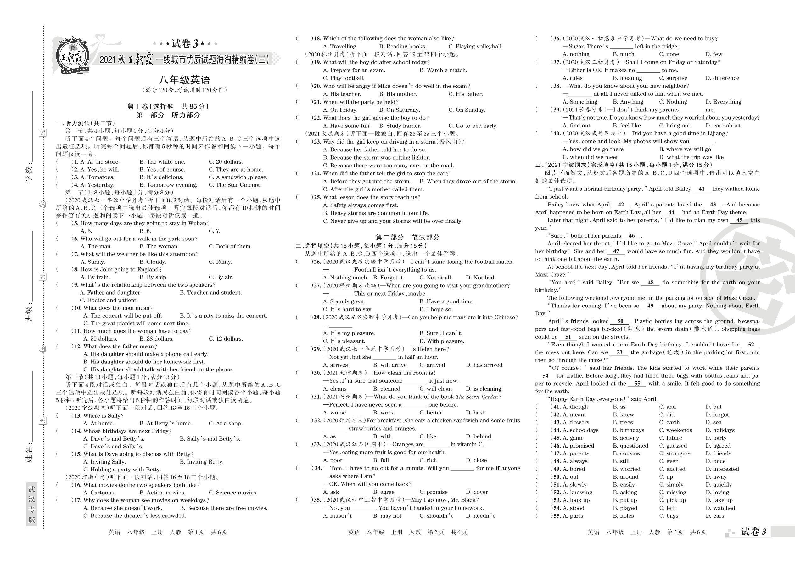 2021秋王朝霞一线城市优质试题海淘精编卷(三)八年级上册英语(人教版)【3】
