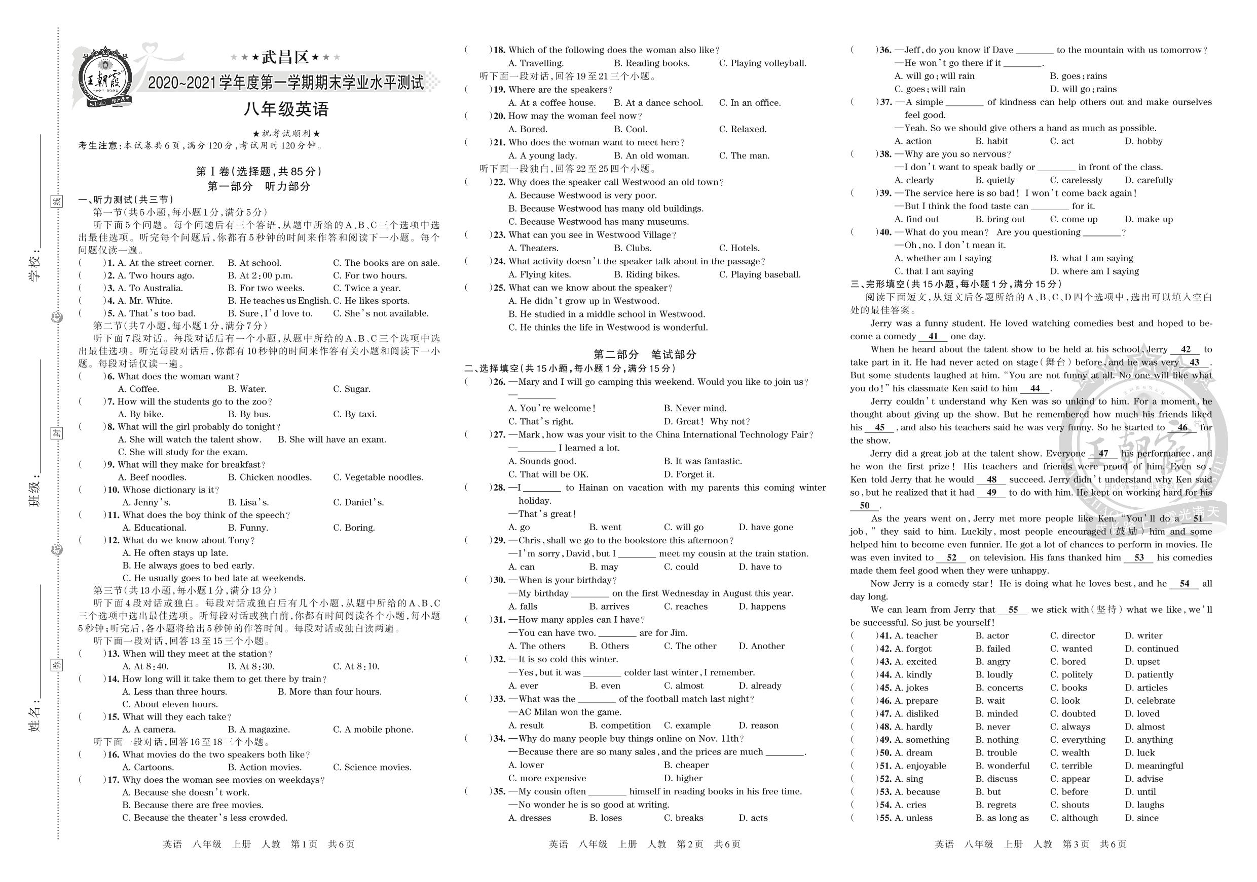 武昌区2020~2021学年度第一学期期末学业水平测试八年级英语(人教版)【7】