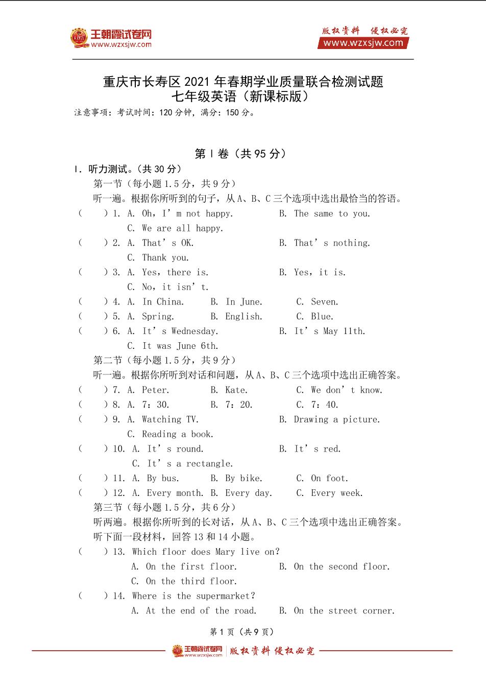 重庆市长寿区2021年春期学业质量联合检测试题七年级英语(新课标版)【无听力音频】