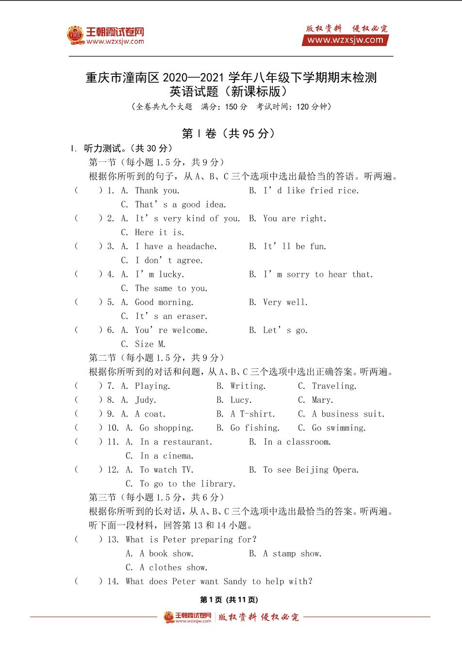 重庆市潼南区2020—2021学年八年级下学期期末检测英语试题(新课标版)【无听力音频】