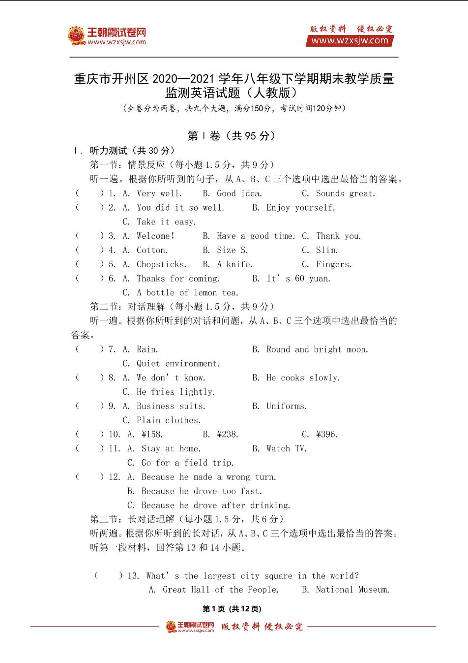 重庆市开州区2020—2021学年八年级下学期期末教学质量监测英语试题(人教版)【无听力音频】