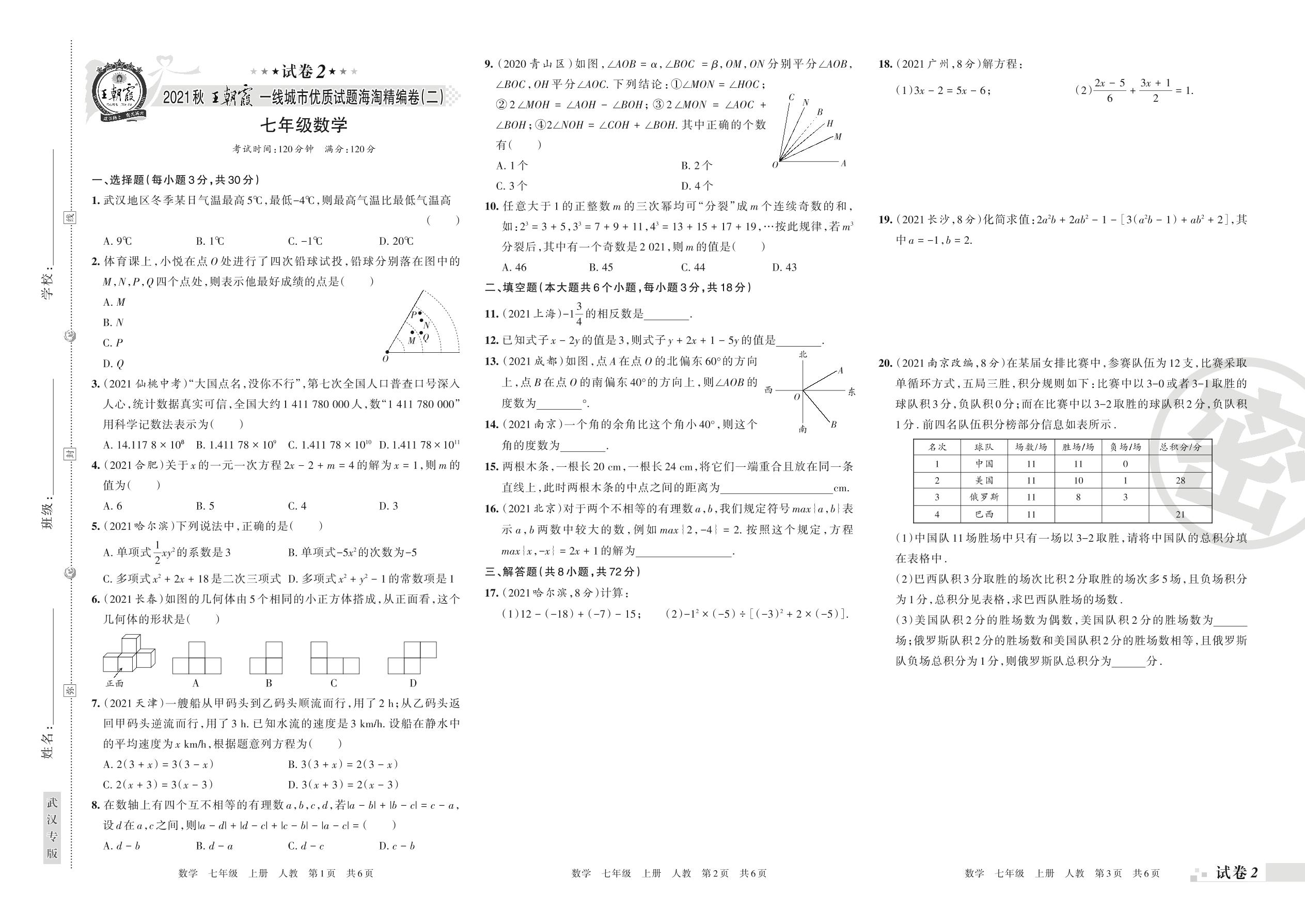 2021秋王朝霞一线城市优质试题海淘精编卷(二)七年级上册数学(人教版)【2】