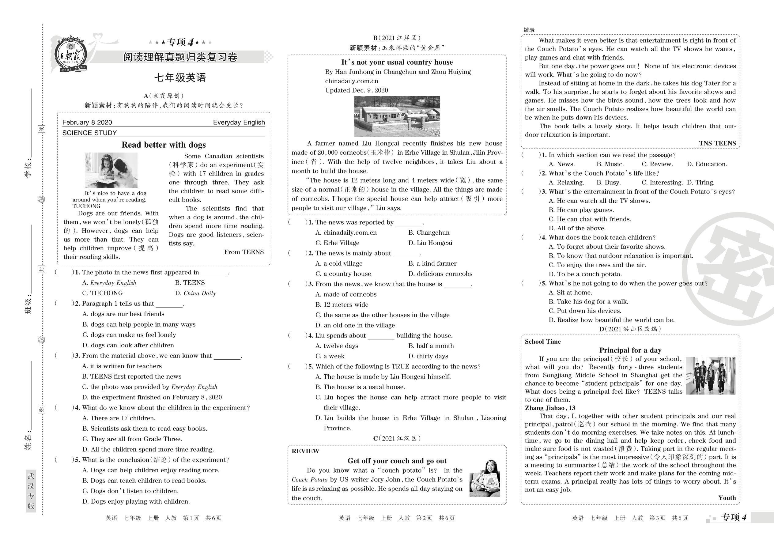 王朝霞期末专项卷——阅读理解真题归类复习卷七年级上册英语(人教版)_R220110095604120【4】