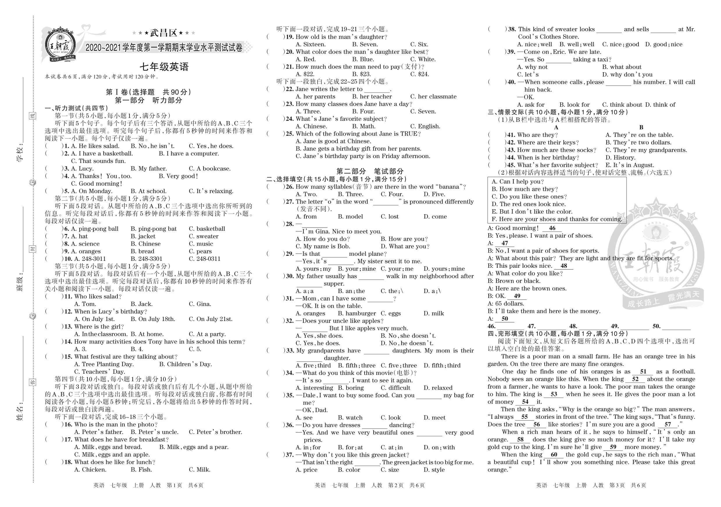 武昌区2020~2021学年度第一学期期末学业水平测试试卷七年级英语(人教版)【7】