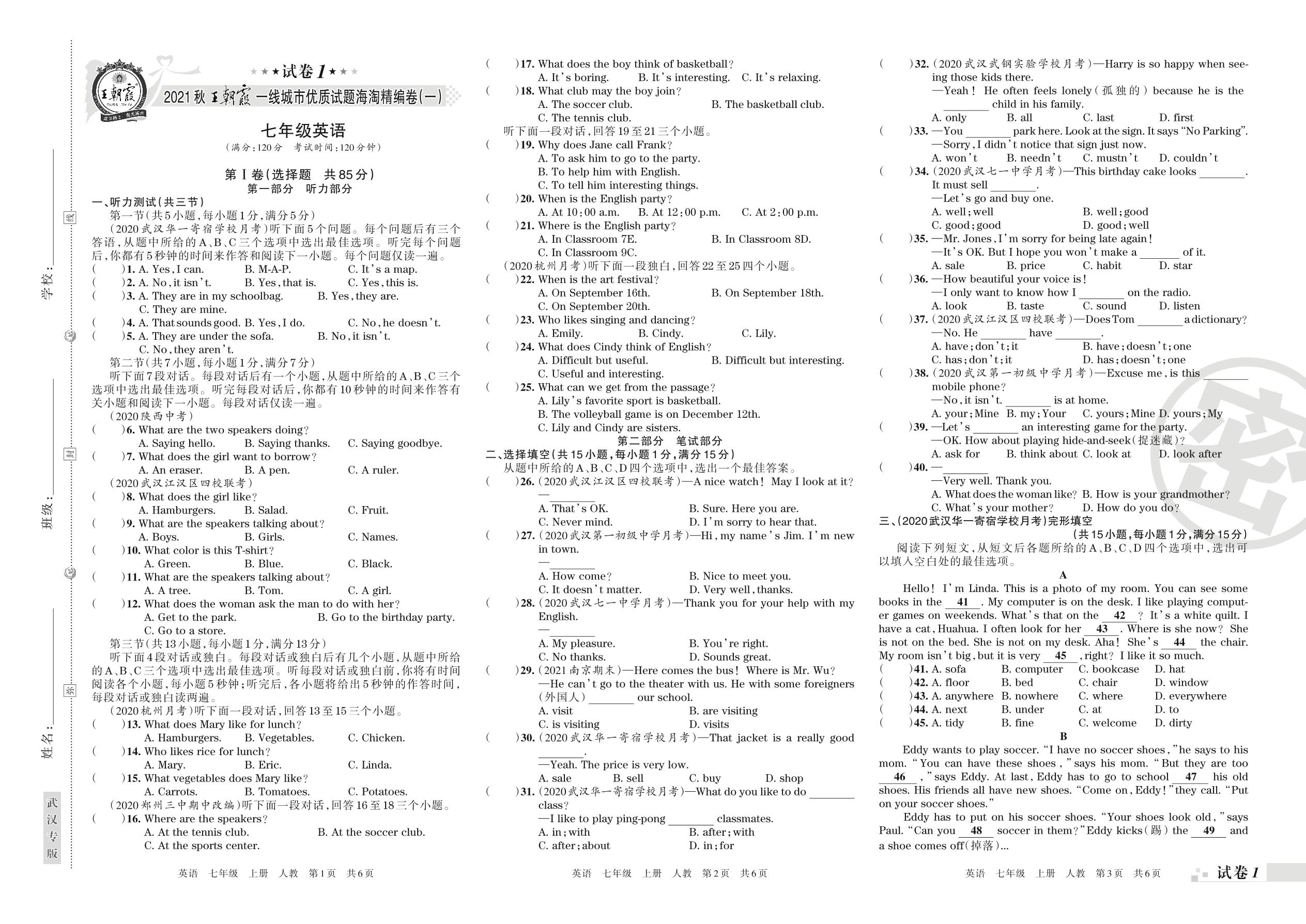 2021秋王朝霞一线城市优质试题海淘精编卷(一)七年级上册英语(人教版)【1】
