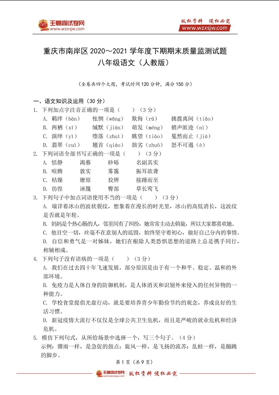 重庆市南岸区2020~2021学年度八年级下期期末语文质量监测试题(人教版)