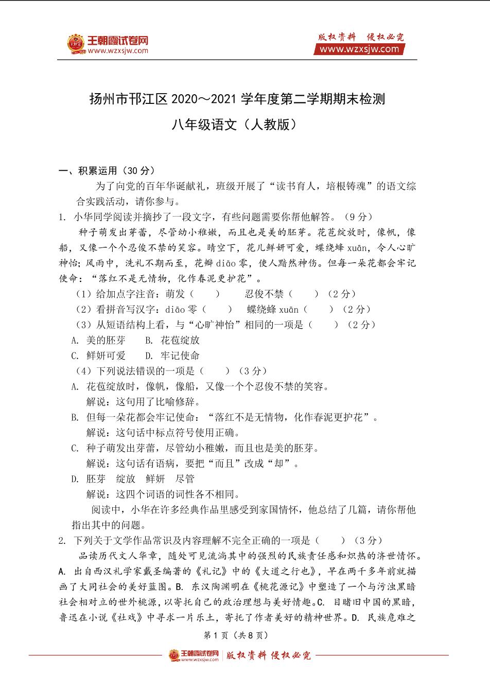 扬州市邗江区2020~2021学年度第二学期期末检测八年级语文(人教版)