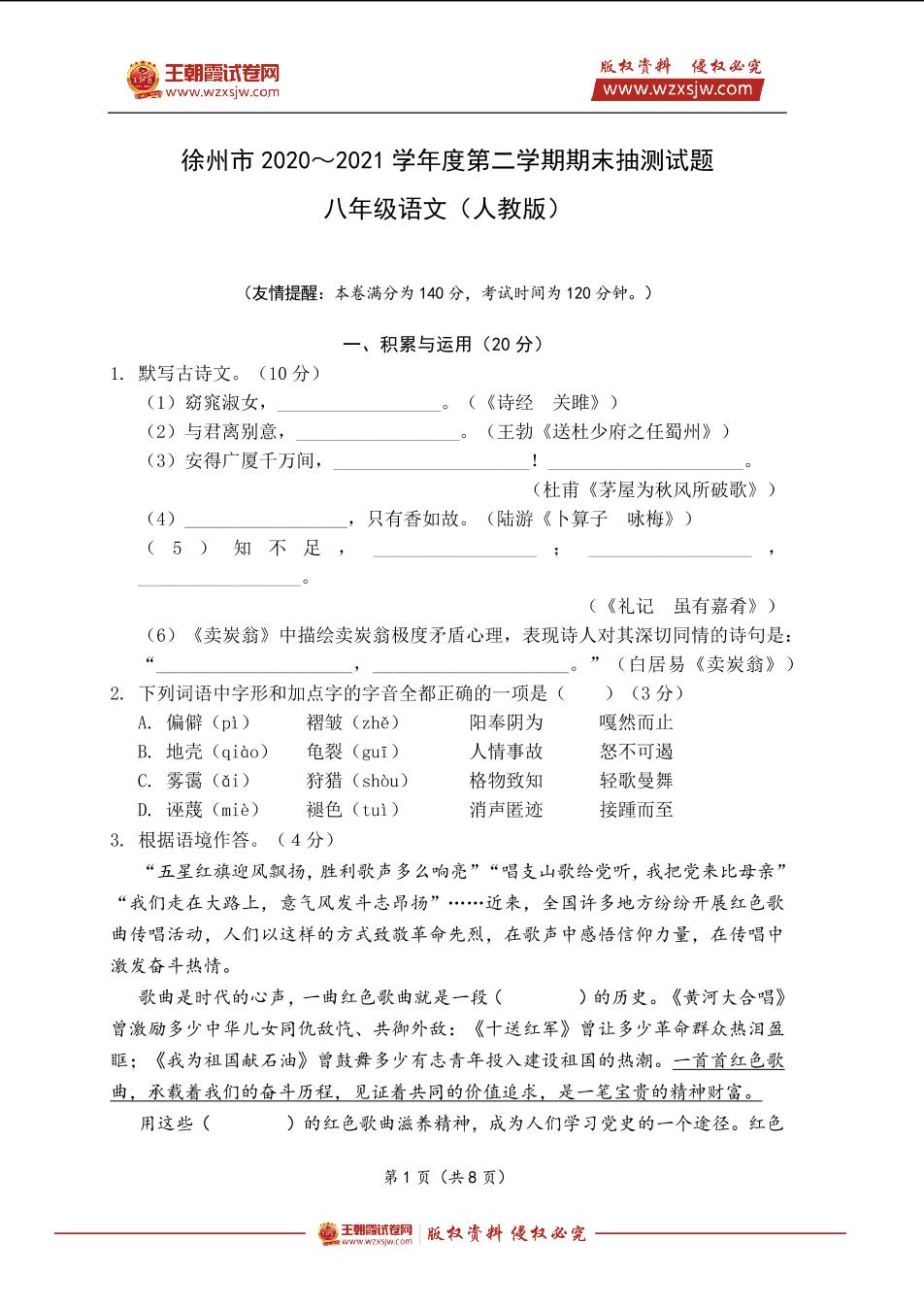 徐州市2020~2021学年度第二学期期末抽测八年级语文试题(人教版)