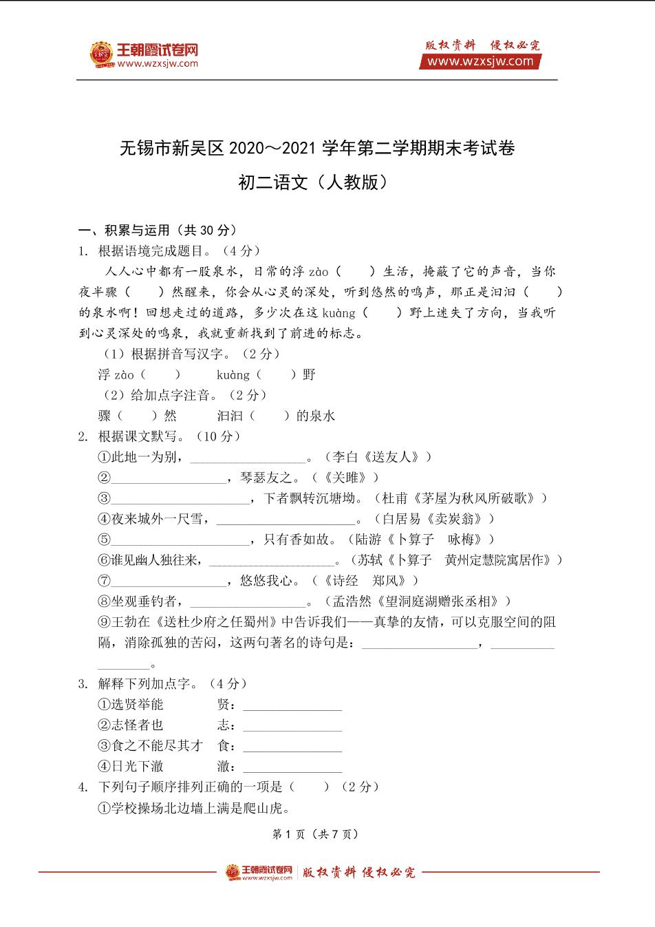 无锡市新吴区2020~2021学年第二学期期末考试卷初二语文(人教版)