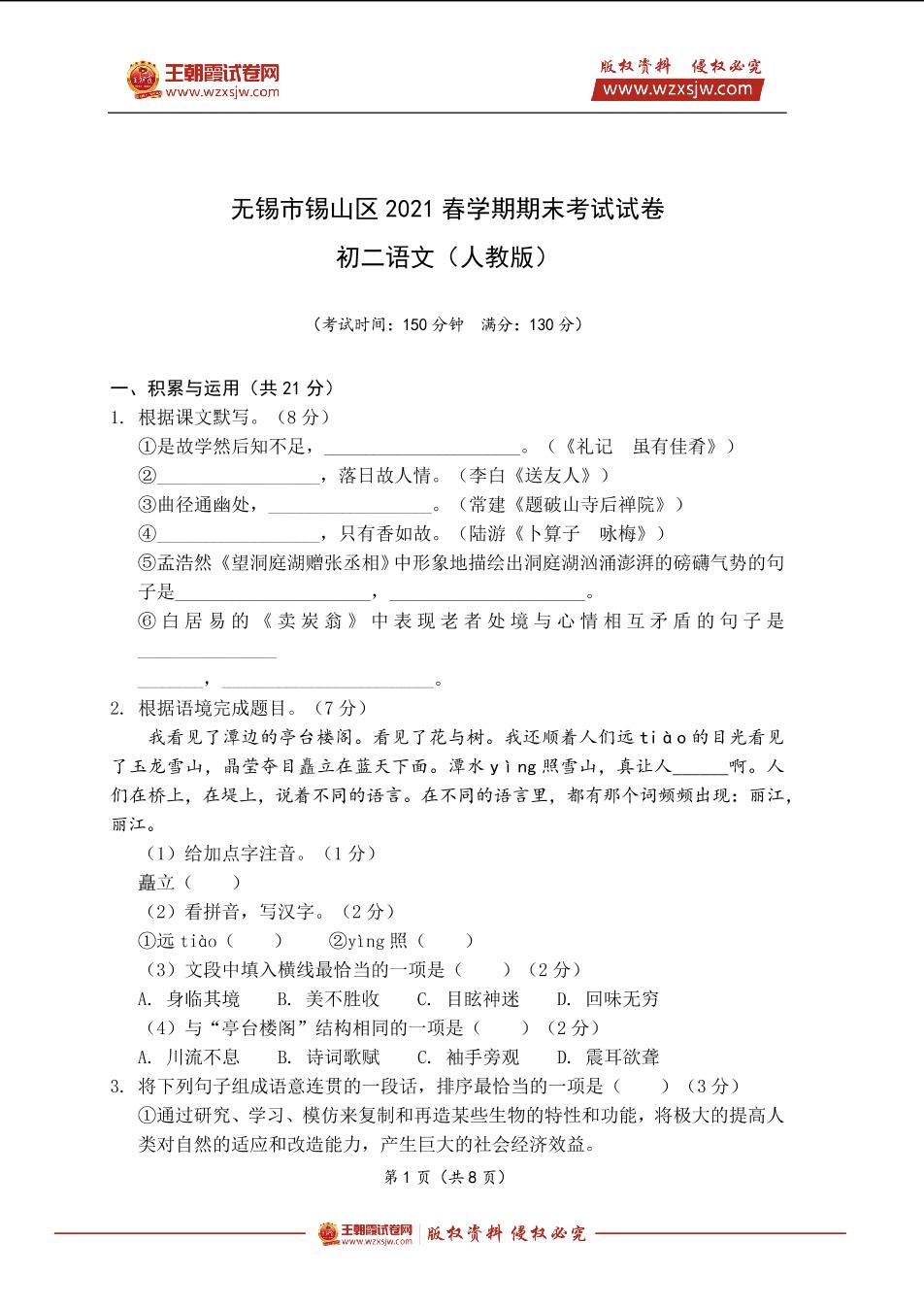 无锡市锡山区2021春学期期末考试试卷初二语文(人教版)