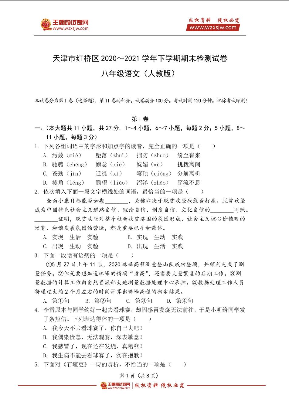 天津市红桥区2020~2021学年八年级下学期期末检测语文试卷(人教版)