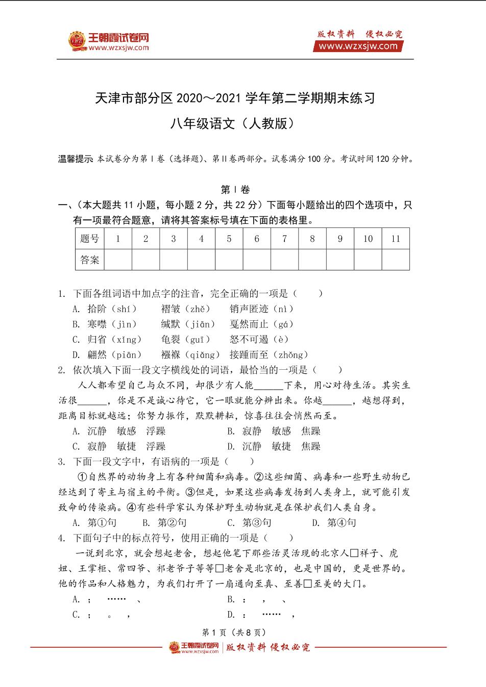 天津市部分区2020~2021学年八年级语文第二学期期末练习 (人教版)