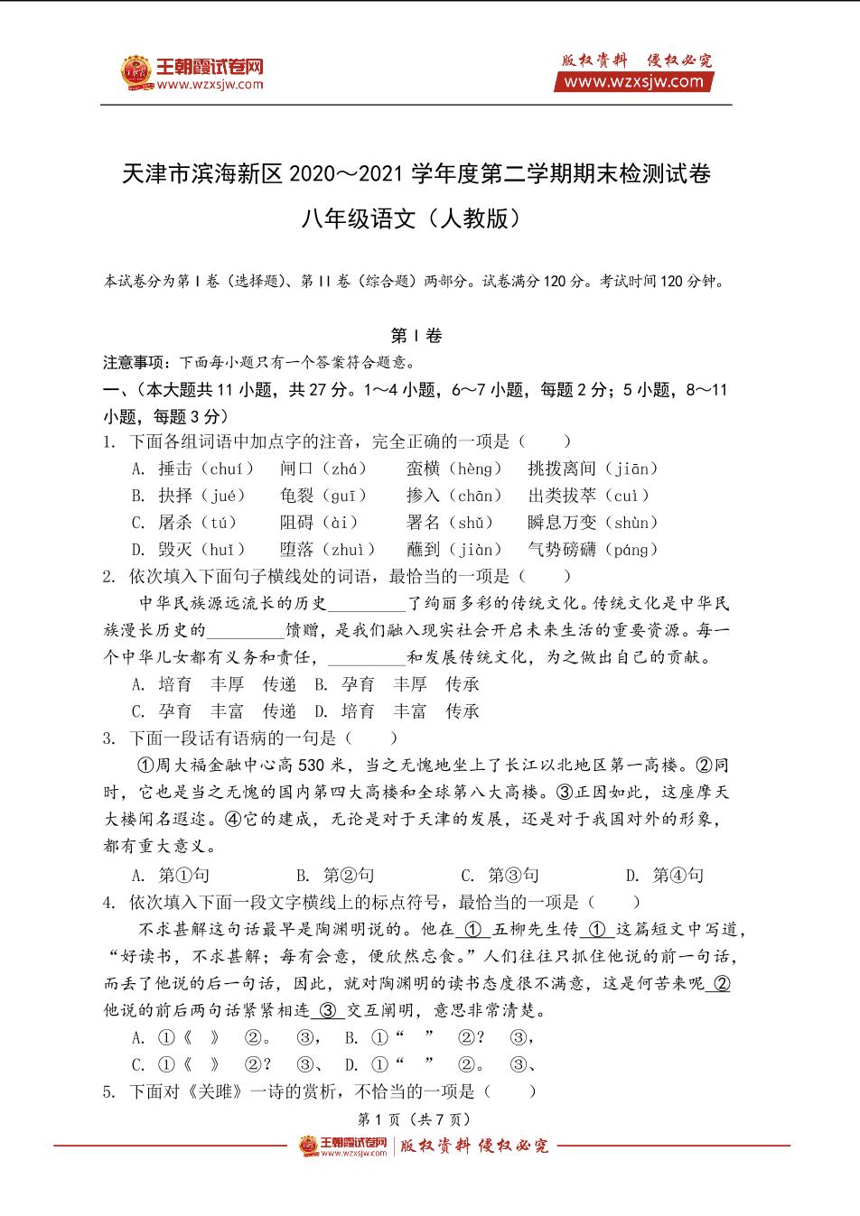 天津市滨海新区2020~2021学年度第二学期八年级语文期末检测试卷(人教版)