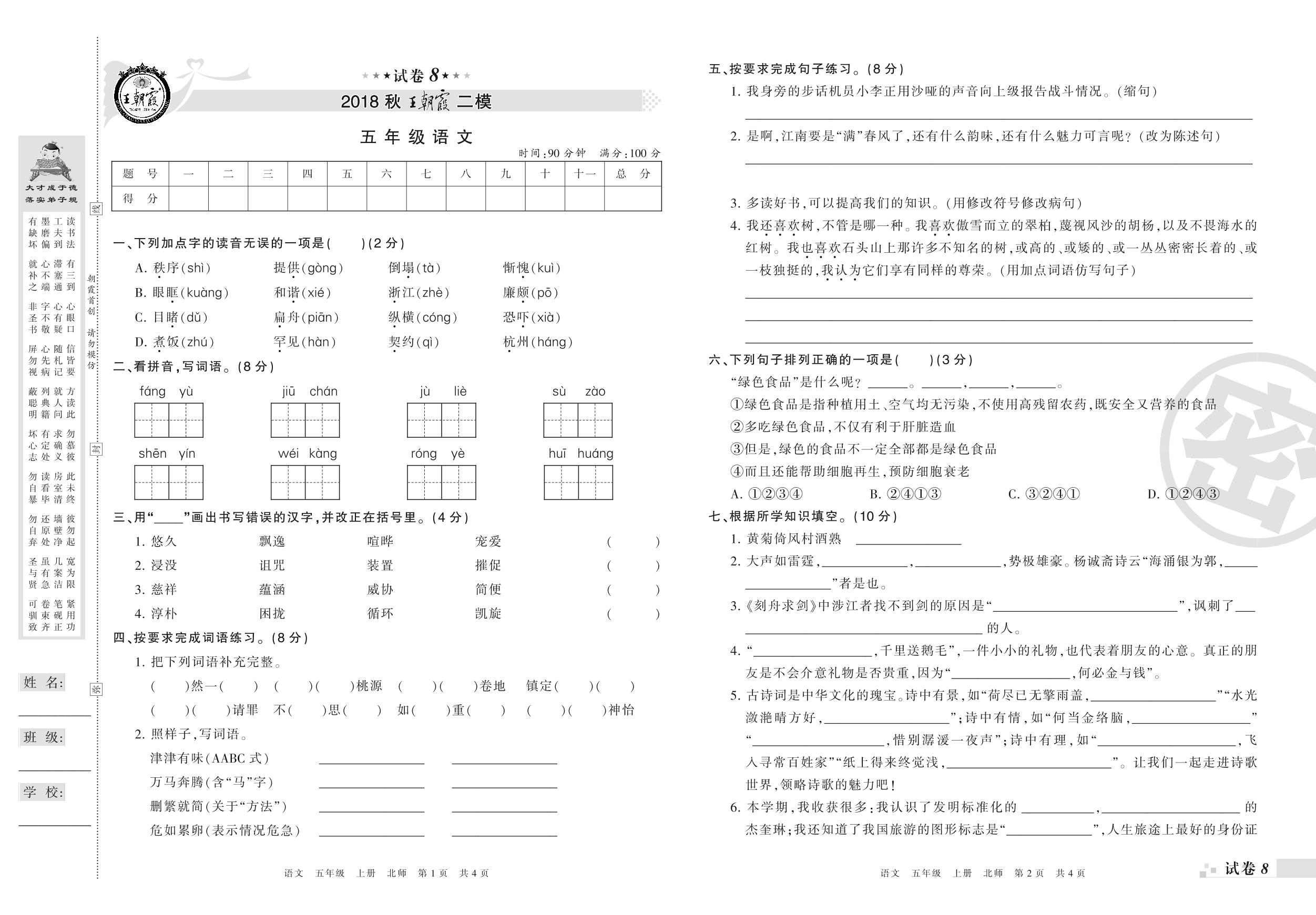 王朝霞期末模拟卷五年级上册语文(北师版)【8】