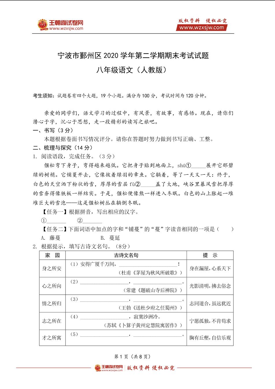 宁波市鄞州区2020学年第二学期八年级期末考试语文试题(人教版 )