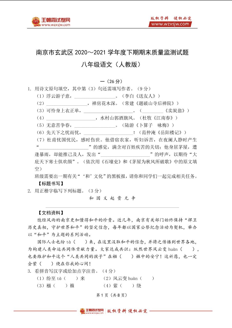 南京市玄武区2020~2021学年度八年级下期期末语文质量监测试题(人教版)