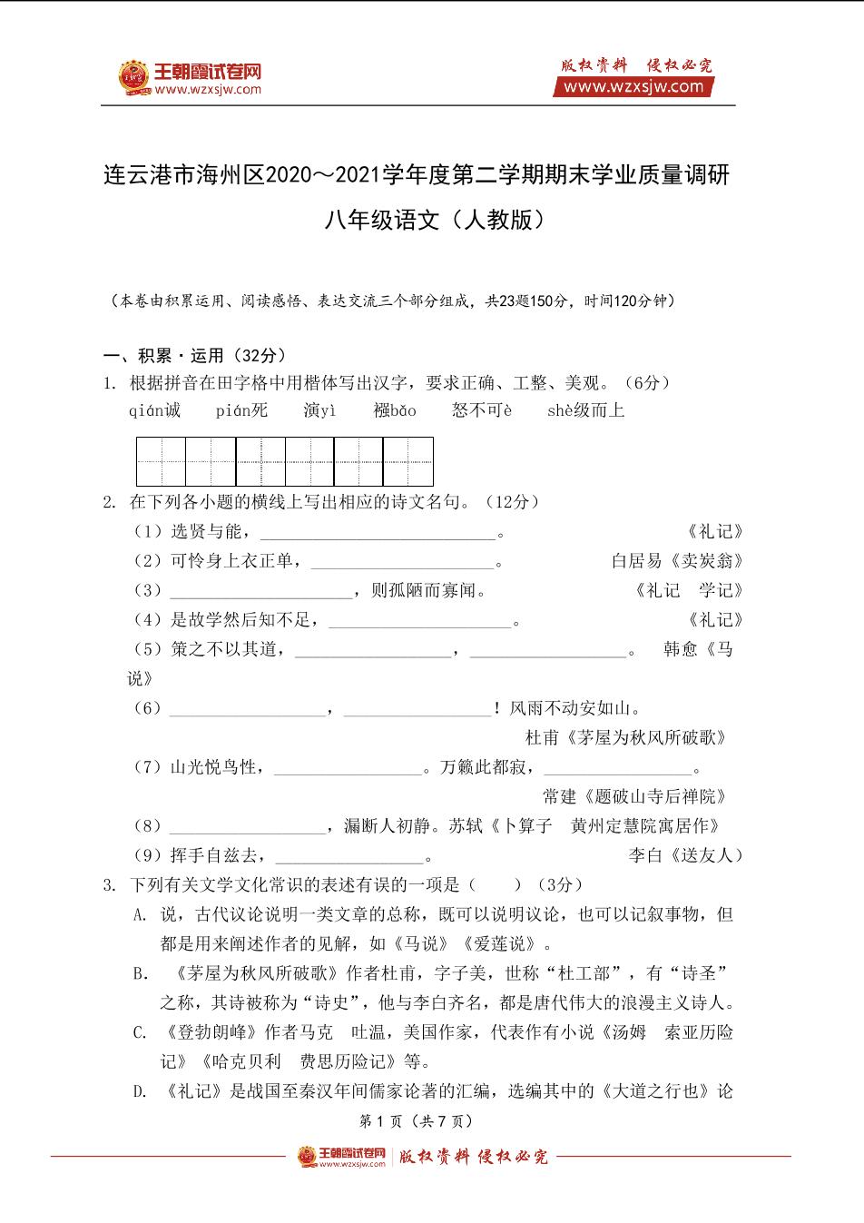 连云港市海州区2020~2021学年度第二学期期末学业质量调研八年级语文(人教版)