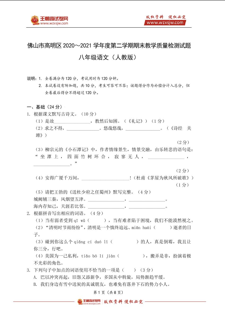 佛山市高明区2020~2021学年度第二学期期末教学质量检测八年级语文试题 (人教版)