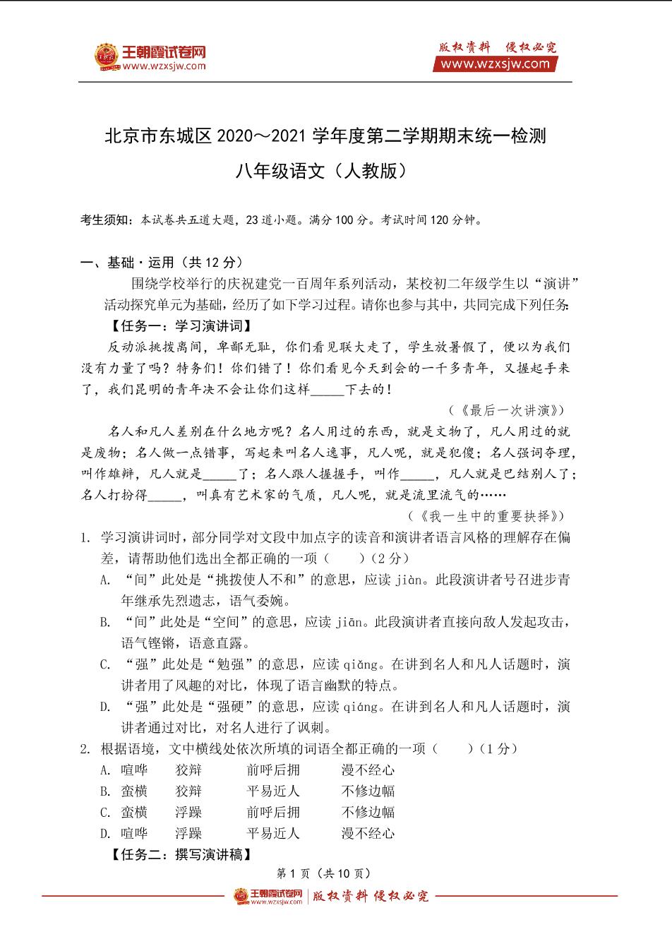 北京市东城区2020~2021学年度第二学期八年级语文期末统一检测(人教版)