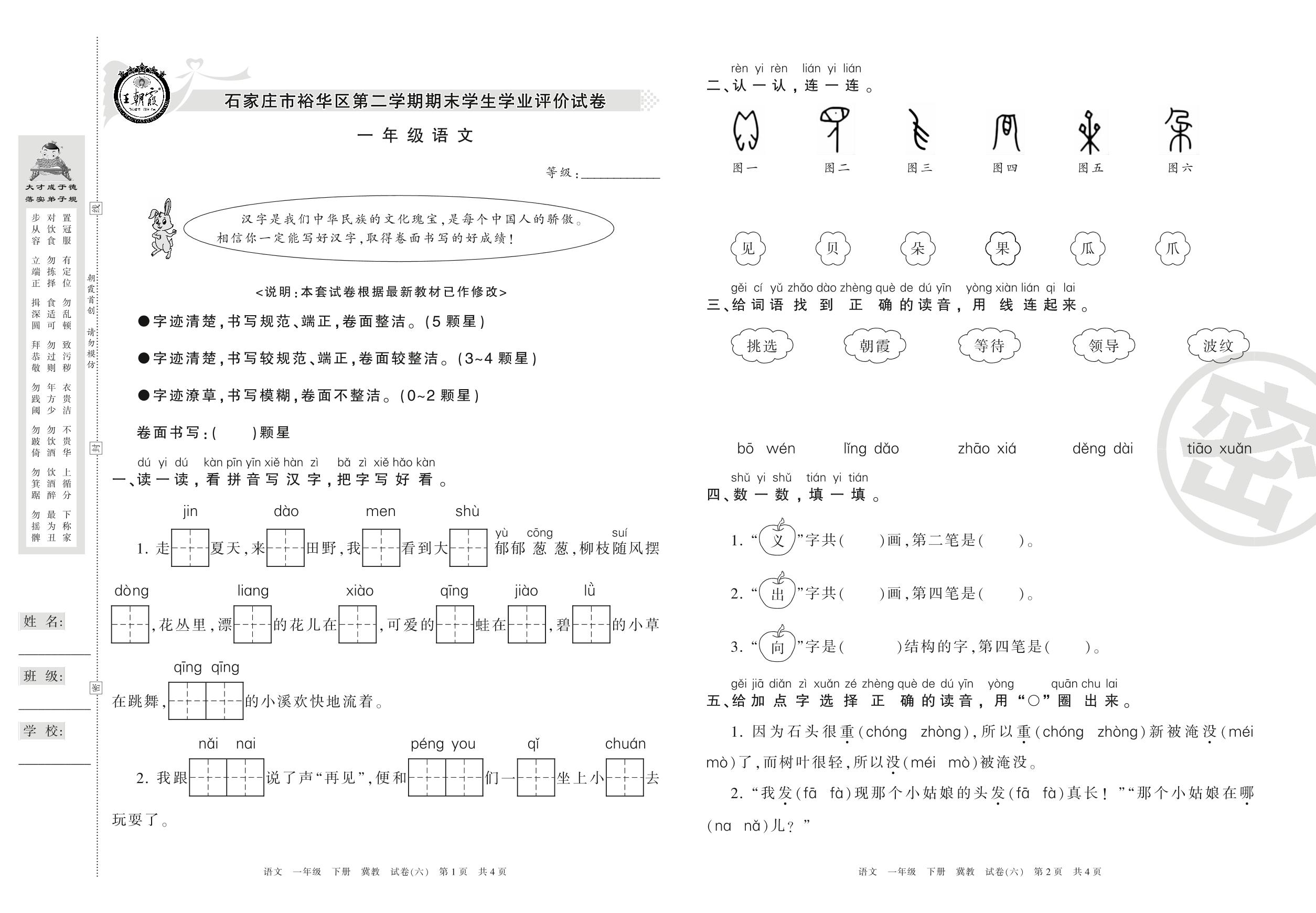 一年级语文冀教版下册期末卷