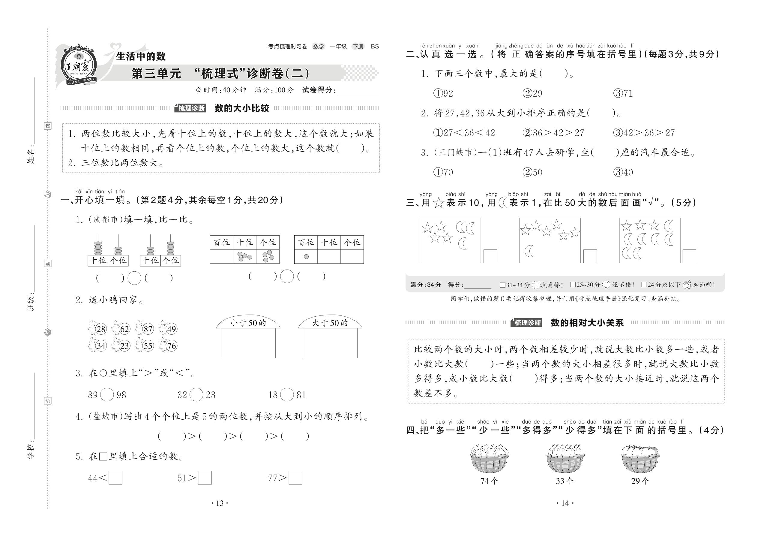 2022下册一年级数学北师版 第三单元 “梳理式”诊断卷(二)