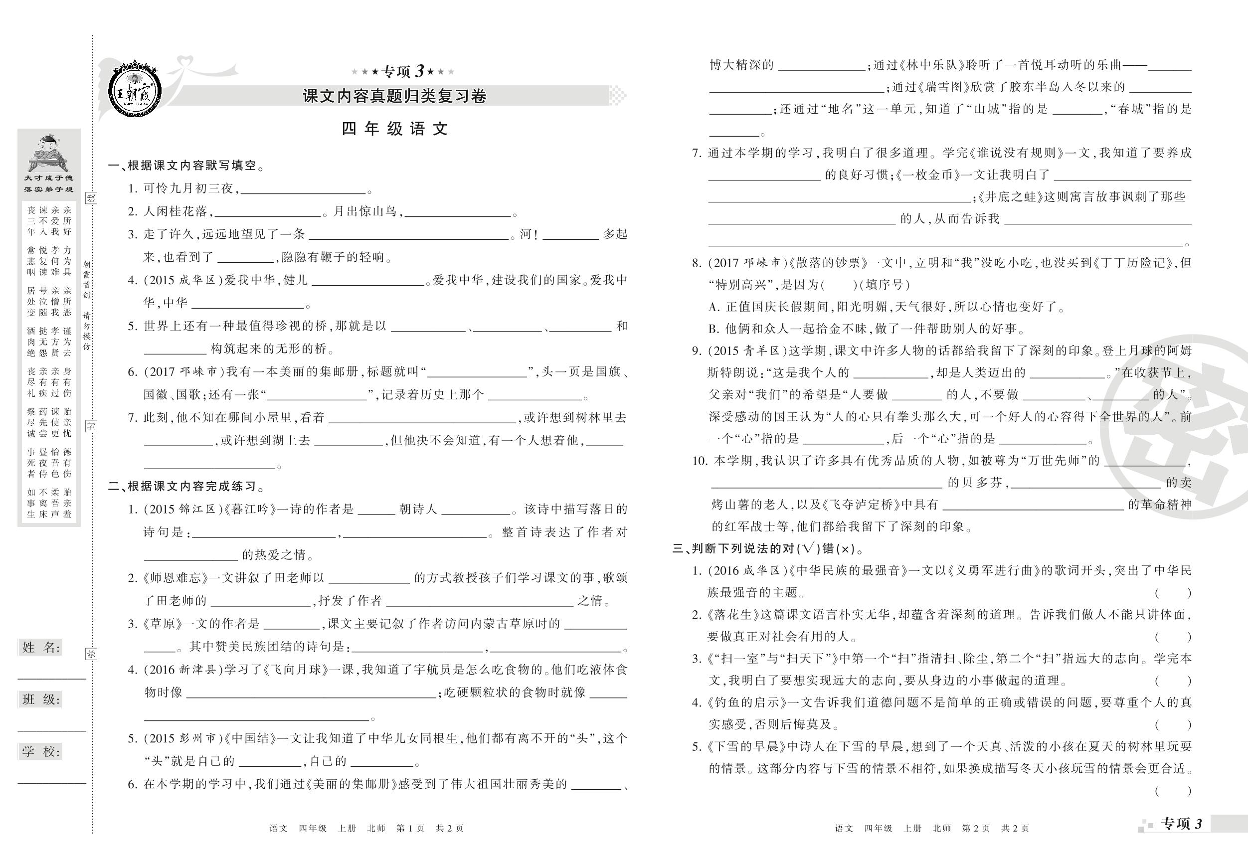王朝霞期末专项卷——课文内容、积累运用真题归类复习四年级上册语文(北师版)【0】