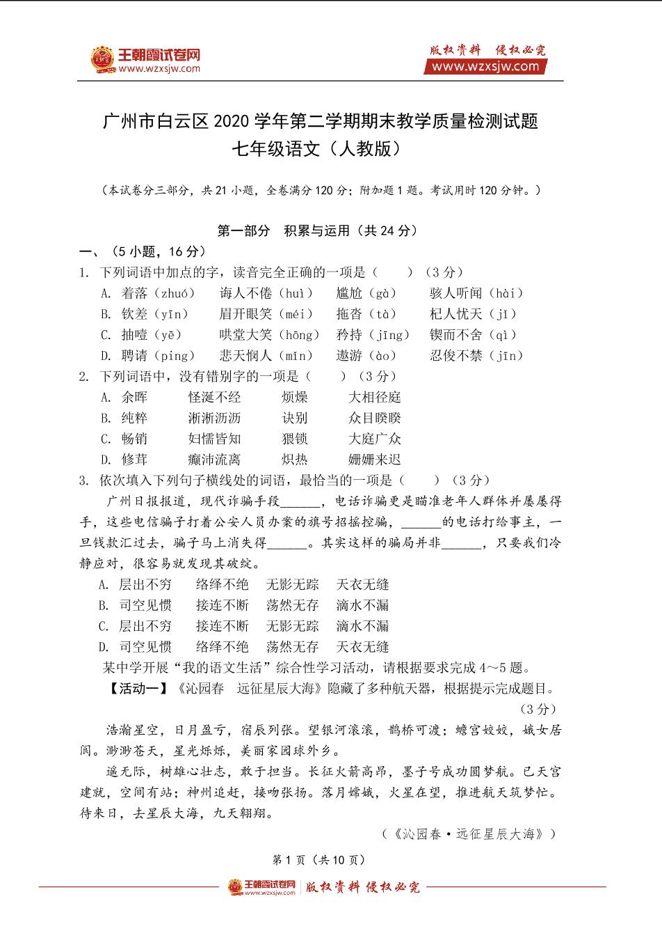 广州市白云区2020学年第二学期期末七年级语文测试题(人教版)