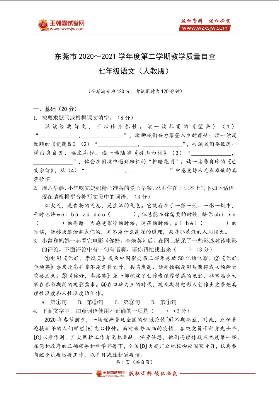 东莞市2020~2021学年度第二学期教学质量自查七年级语文(人教版)