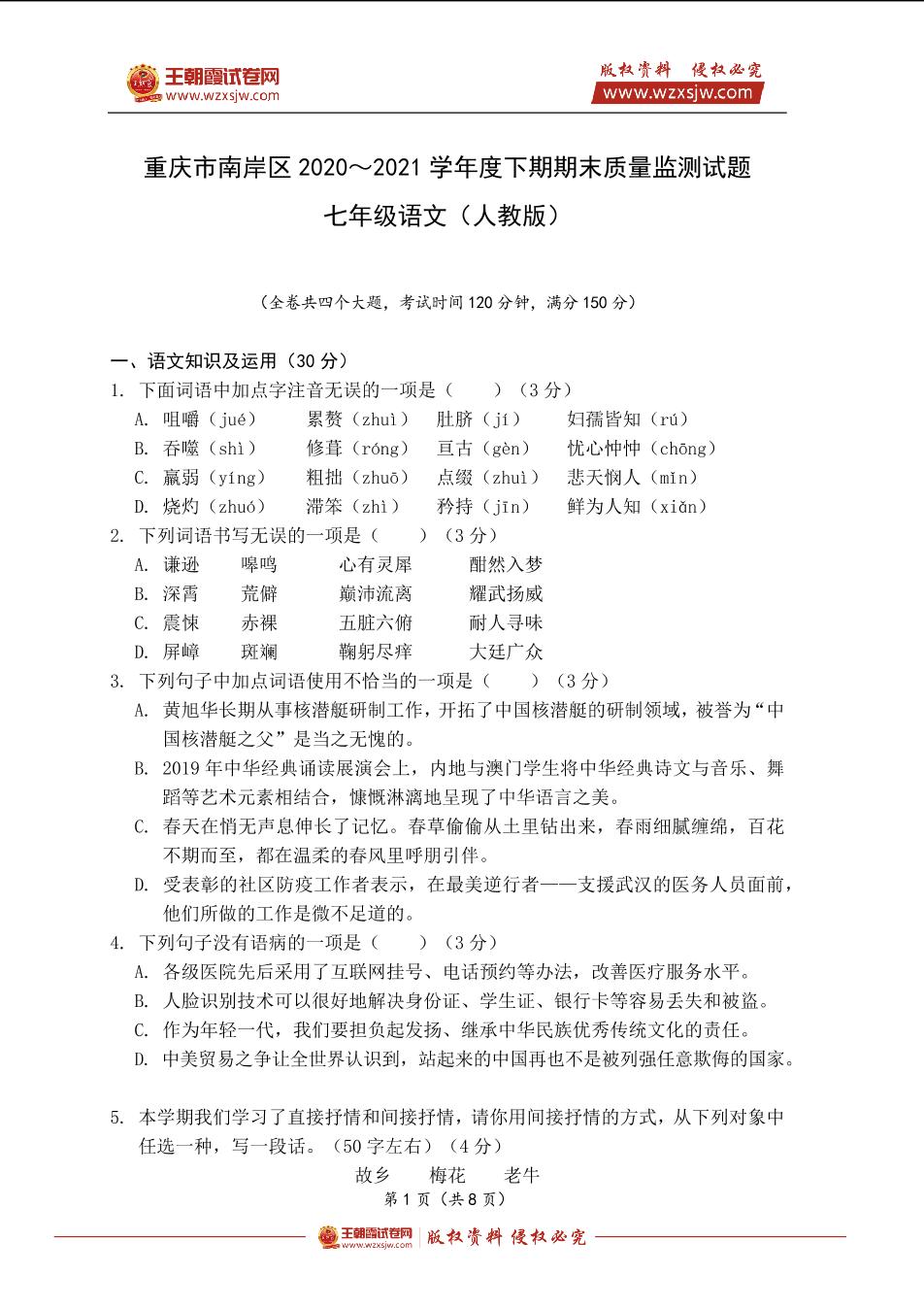 重庆市南岸区2020~2021学年度下期七年级期末质量监测试题语文(人教版)