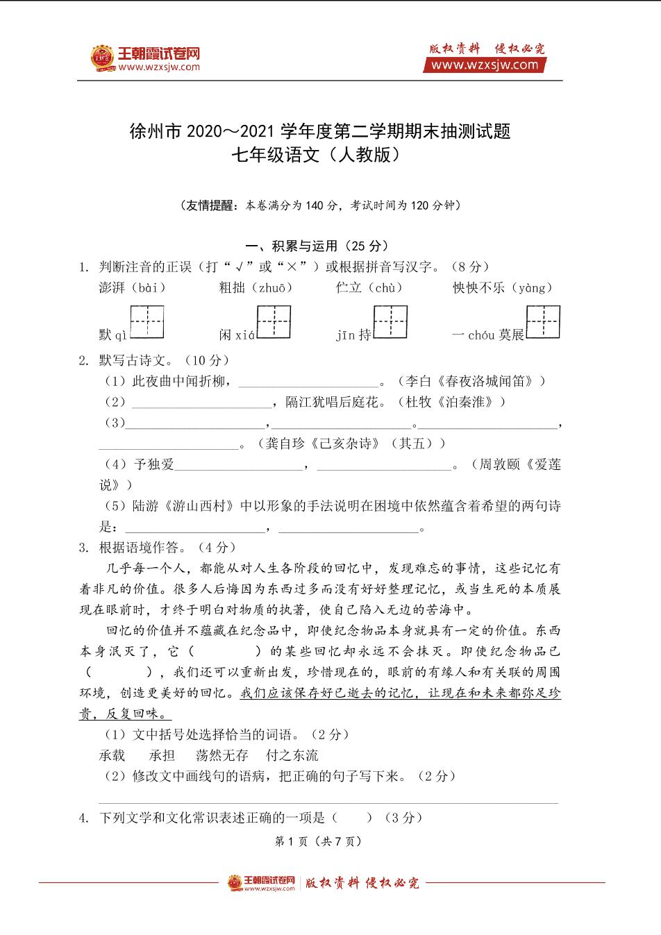 徐州市2020~2021学年度第二学期七年级语文期末抽测试题(人教版)