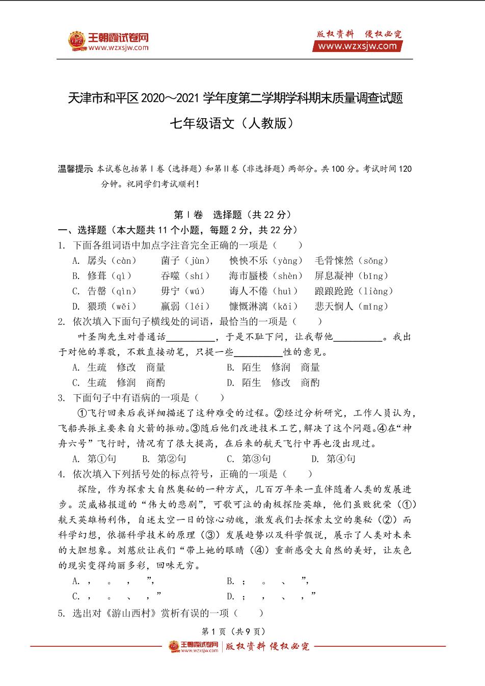 天津市和平区2020~2021学年度第二学期七年级语文学科期末质量调查试题(人教版)